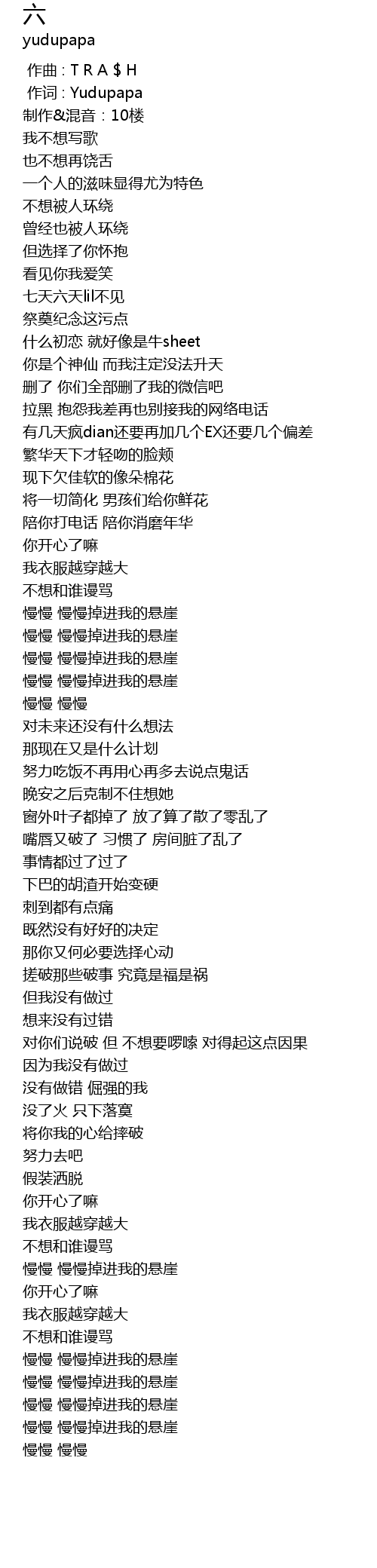 | [00:57.832] | màn màn màn màn diào jìn wǒ de xuán yá |