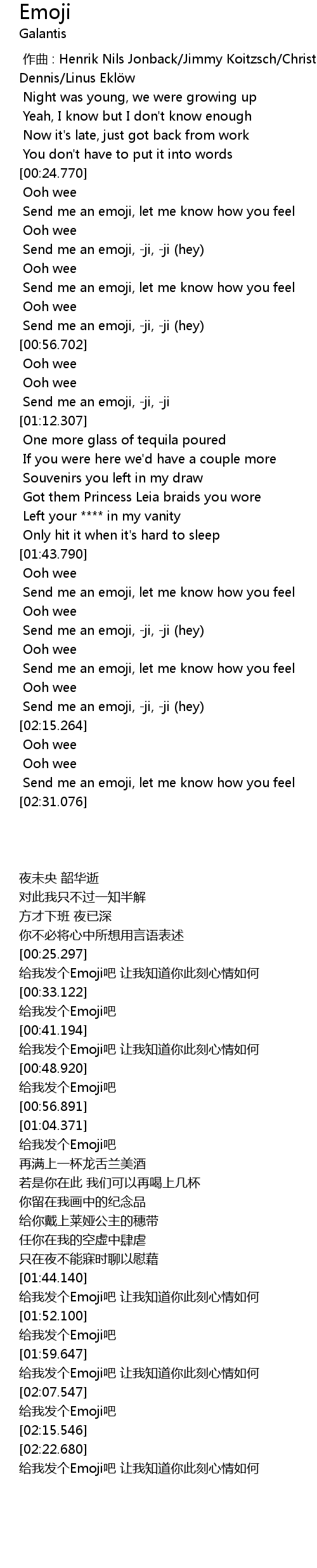 | [00:38.009] | Send me an emoji, ji, ji hey |