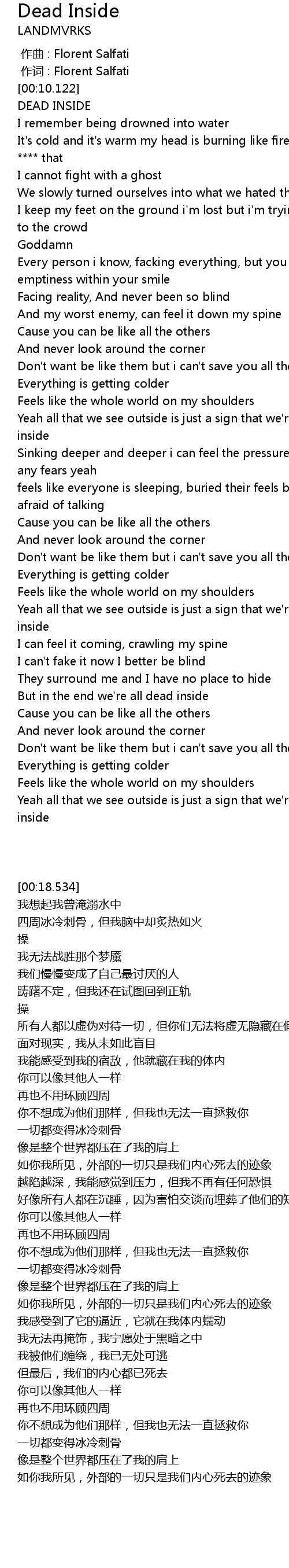 | [03:18.152] | Yeah all that we see outside is just a sign that we're all dead inside |