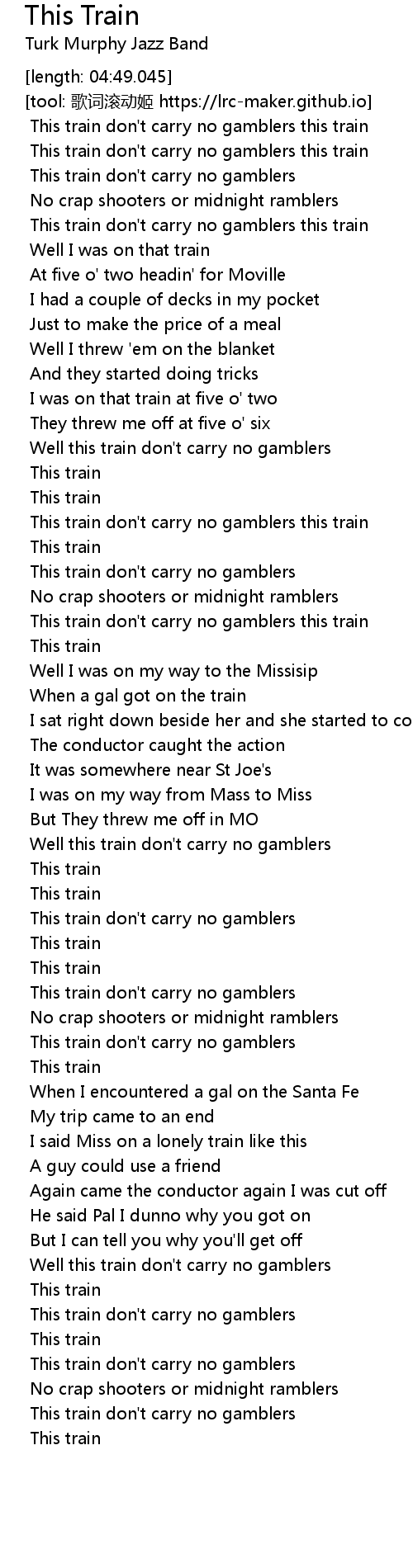 | [00:06.324] | This train don' t carry no gamblers this train |