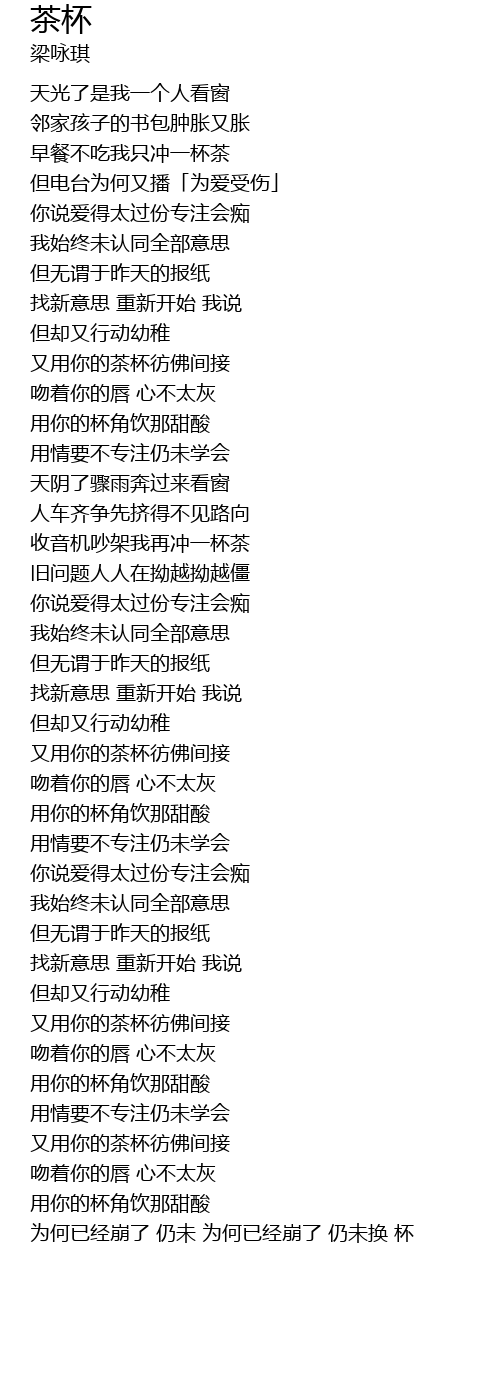 | [01:58.98] | 又用你的茶杯彷佛间接 |