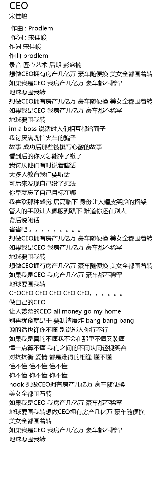 | [03:12.182] | 如果我是CEO 我房产几亿万 豪车都不稀罕 地球要围我转想做CEO拥有房产几亿万 豪车随便换 美女全都围着转 |