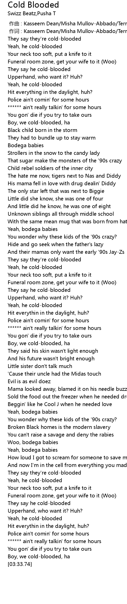 | [00:25.23] | Yeah, he cold-blooded |