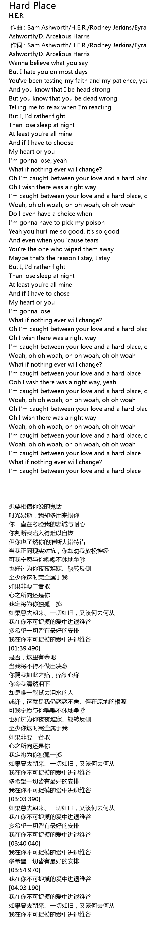 | [00:01.000] | zuò cí : Sam Ashworth H. E. R. Rodney Jerkins Eyram Ruby Amanfu Ashworth D. Arcelious Harris |