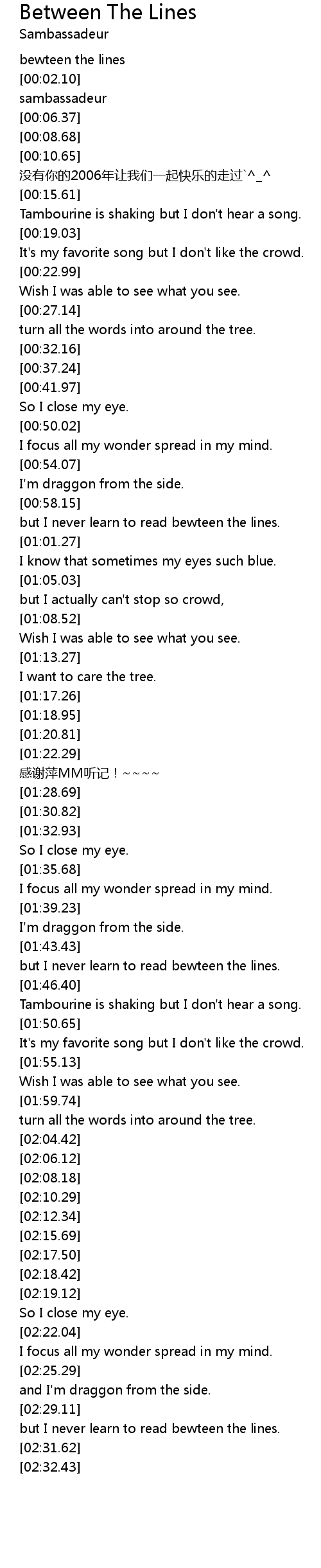 | [02:30.46] | but I never learn to read bewteen the lines. |