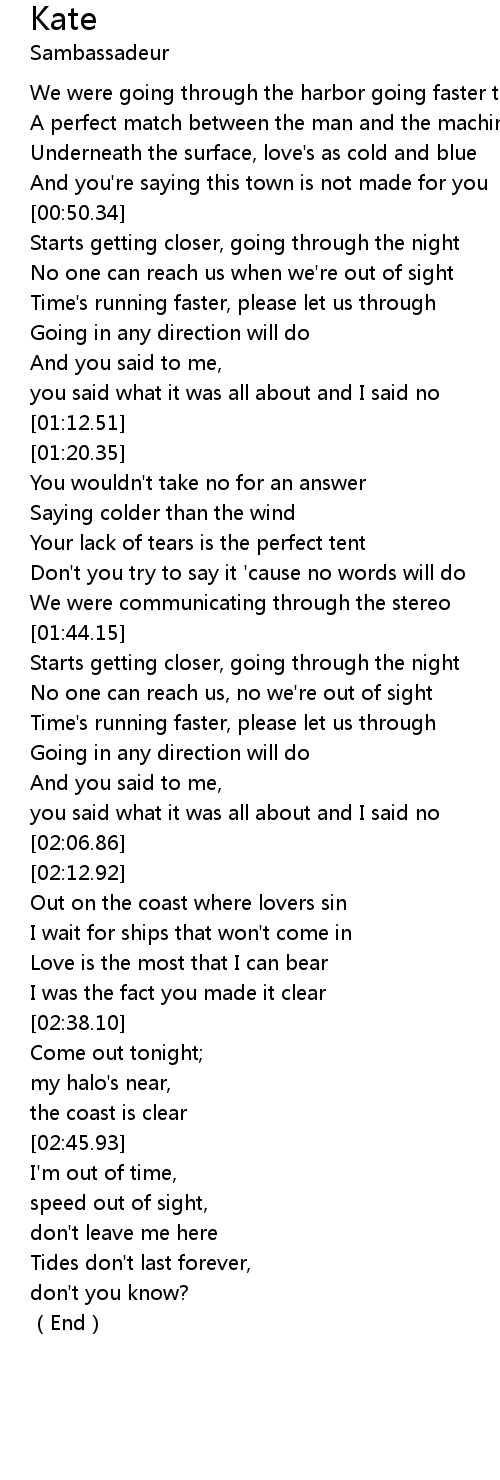 | [01:44.84] | Starts getting closer, going through the night |
