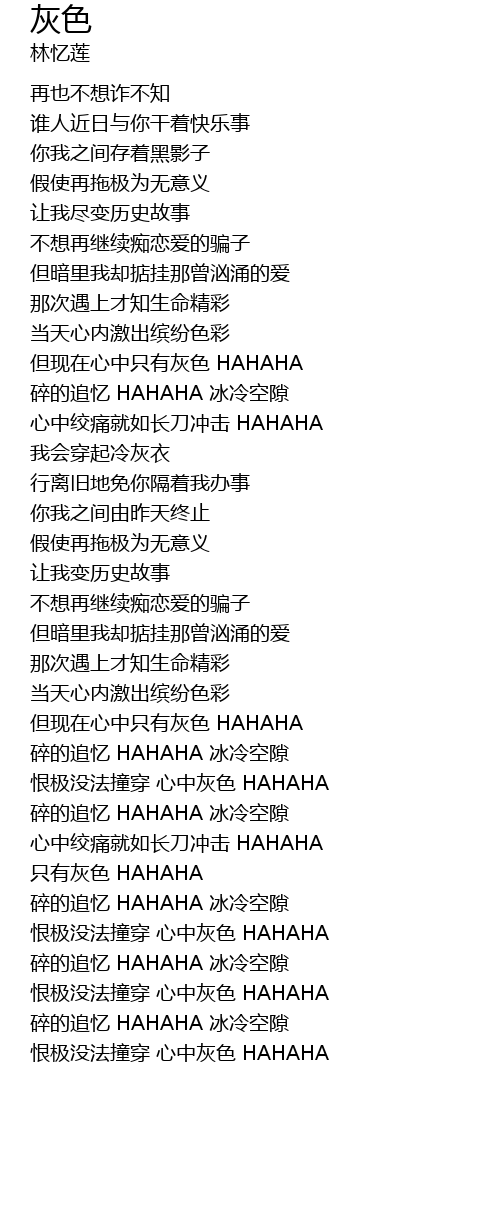| [02:12.000] | 但现在心中只有灰色 HAHAHA |