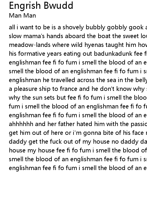 all i want to be is a shovely bubbly gobbly gook a seagull stole him from his slow mama's hands aboard the boat the sweet louisa and dropped him in the meadow-lands where wild hyenas taught him how to hunt old elephants so he spent his formative years eating out badunkadunk fee fi fo fum i smell the blood of an englishman fee fi fo fum i smell the blood of an englishman fee fi fo fum i smell the blood of an englishman fee fi fo fum i smell the blood of an englishman he travelled across the sea in the belly of a japanese businessman on a pleasure ship to france and he don't know why she loves him and he don't know why the sun sets but fee fi fo fum i smell the blood of an englishman fee fi fo fum i smell the blood of an englishman fee fi fo fum i smell the blood of an englishman fee fi fo fum i smell the blood of an englishman bang pow pow pow ahhhhhh and her father hated him with the passion of a dying chinaman he said get him out of here or i'm gonna bite of his face no daddy daddy don't daddy daddy get the fuck out of my house no daddy daddy don't daddy daddy this is my house my house fee fi fo fum i smell the blood of an englishman fee fi fo fum i smell the blood of an englishman fee fi fo fum i smell the blood of an englishman fee fi fo fum i smell the blood of an englishman |