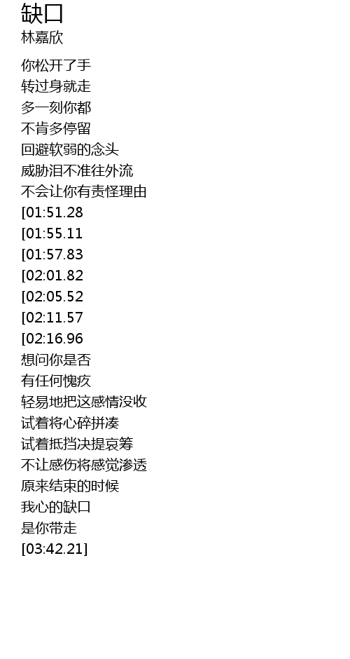 | [03:30.15] | 我心的缺口 |