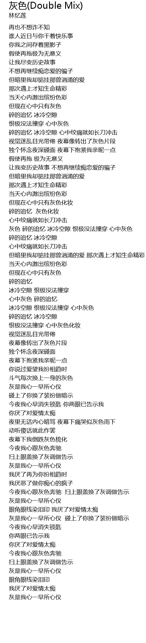 | [09:49.38] | 今夜我心跟灰色奔驰 扫上眼盖换了灰调做告示 灰是我心一早所心仪 |