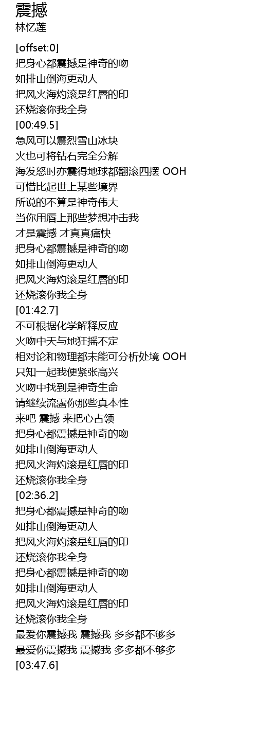 | [03:31.4] | 最爱你震撼我 震撼我 多多都不够多 |
