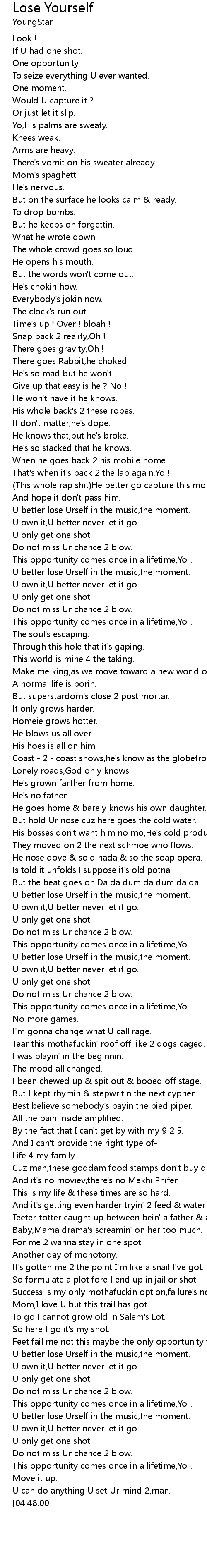 | [04:16.87] | U better lose Urself in the music, the moment. |