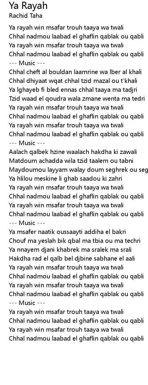 [01:25.42] Ya rayah win msafar trouh taaya wa twali