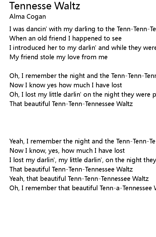 I was dancin' with my darling to the Tenn-Tenn-Tennessee Waltz |
