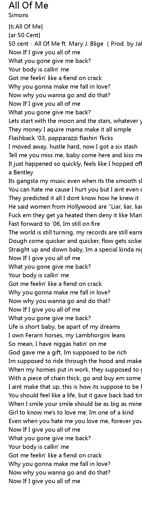 | [00:01.33] | 50 cent - All Of Me ft. Mary J. Blige (Prod. by Jake One) |