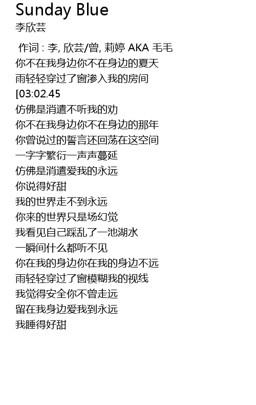 | [02:43.47] | nǐ zài wǒ de shēn biān nǐ zài wǒ de shēn biān bù yuǎn |