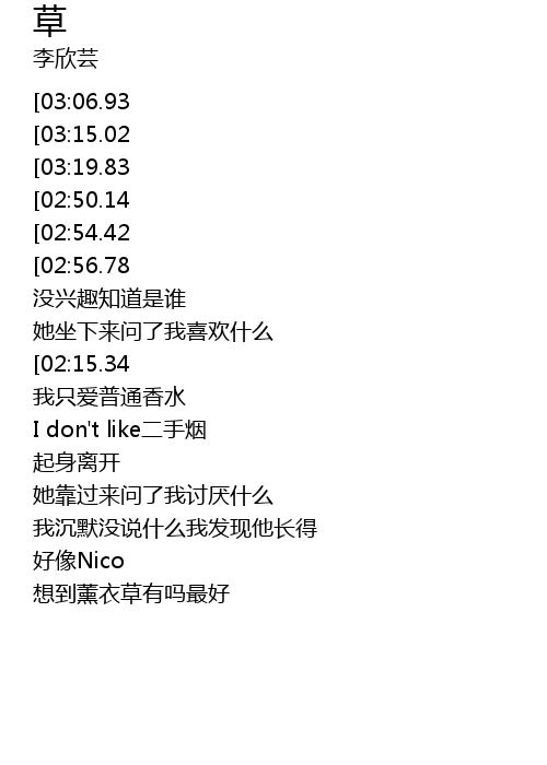 | [00:18.41][03:06.93] | 她走过来有一种草的香味oh relax |