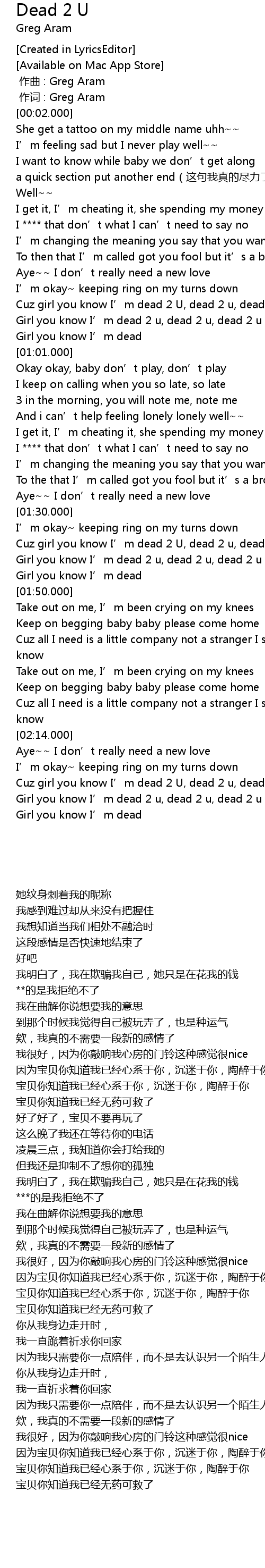 | [02:32.000] | Girl you know I’m dead 2 u, dead 2 u, dead 2 u |