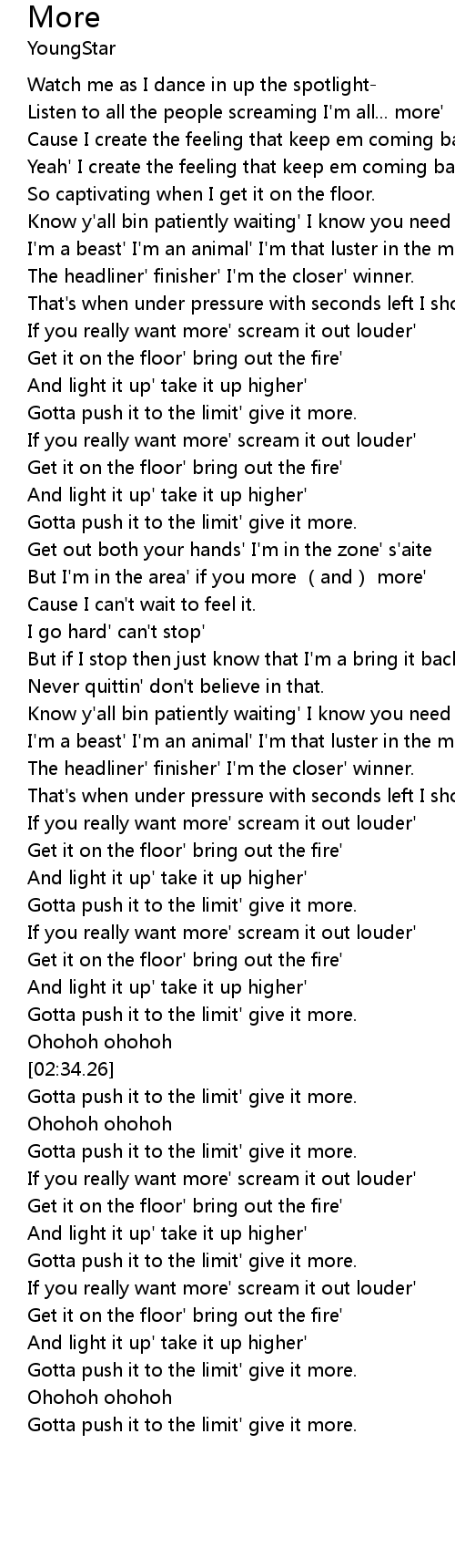 | [03:25.25] | Gotta push it to the limit' give it more. |
