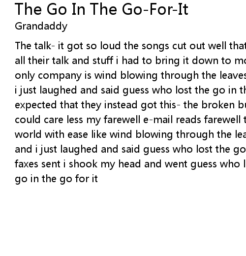 The talk- it got so loud the songs cut out well that's when i'd had enough of all their talk and stuff i had to bring it down to more level ground where my only company is wind blowing through the leaves my head they tried to wreck and i just laughed and said guess who lost the go in the go for it when they expected that they instead got this- the broken but pretty mess what they care i could care less my farewell e-mail reads farewell to thee i'll pass through your world with ease like wind blowing through the leaves my head they tried to wreck and i just laughed and said guess who lost the go in the go for it despite the faxes sent i shook my head and went guess who lost the go in the go for it the go in the go for it |