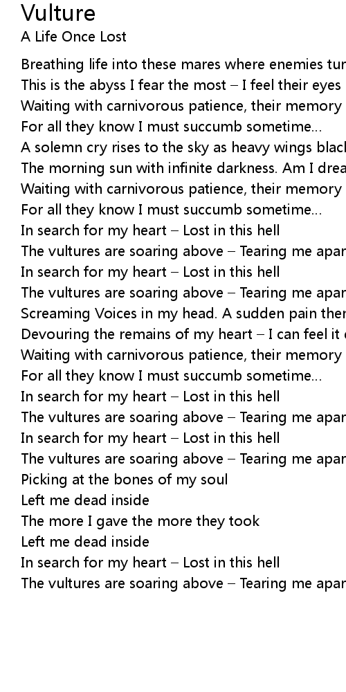 | [03:37.40] | The vultures are soaring above – Tearing me apart |