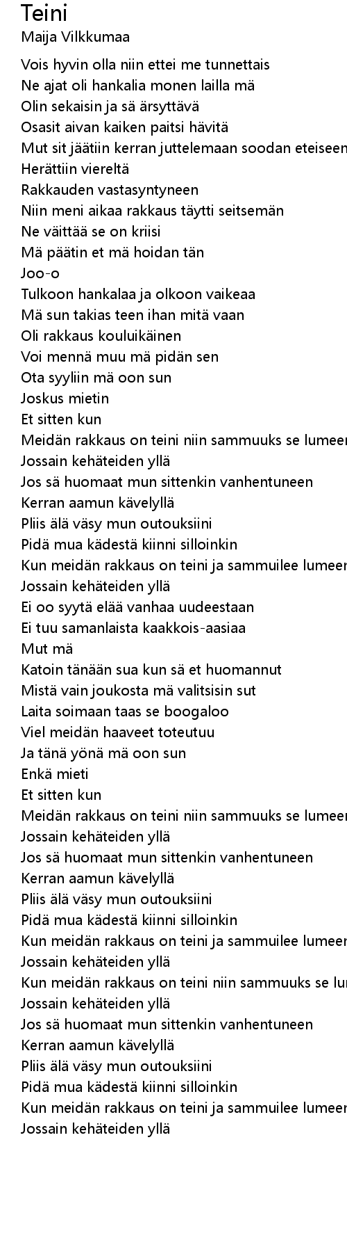 | [03:01.47] | Kun meidän rakkaus on teini niin sammuuks se lumeen |