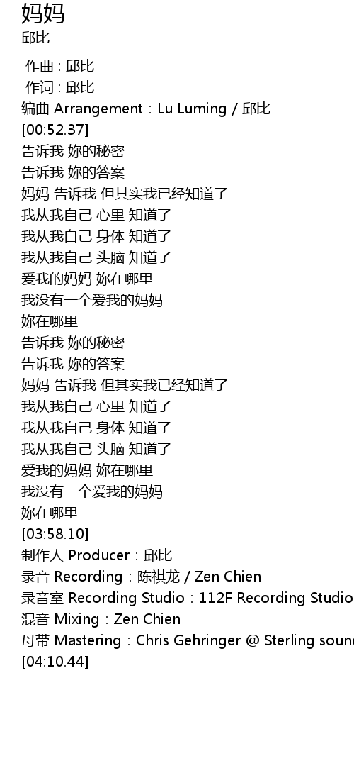 | [04:10.17] | mǔ dài Mastering: Chris Gehringer Sterling sound |