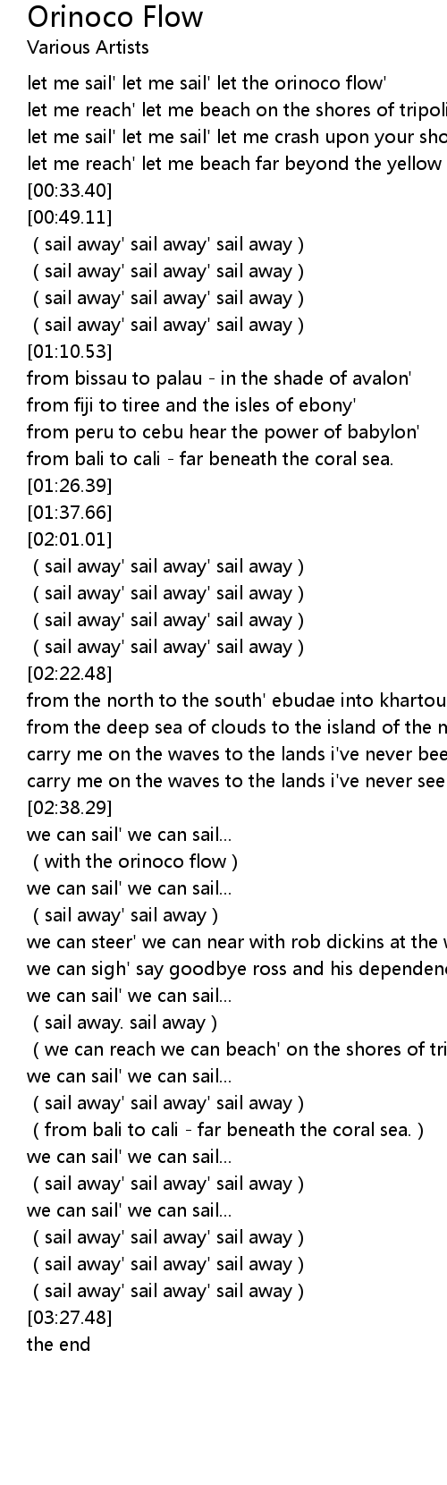 | [00:16.72] | let me sail' let me sail' let the orinoco flow' |
