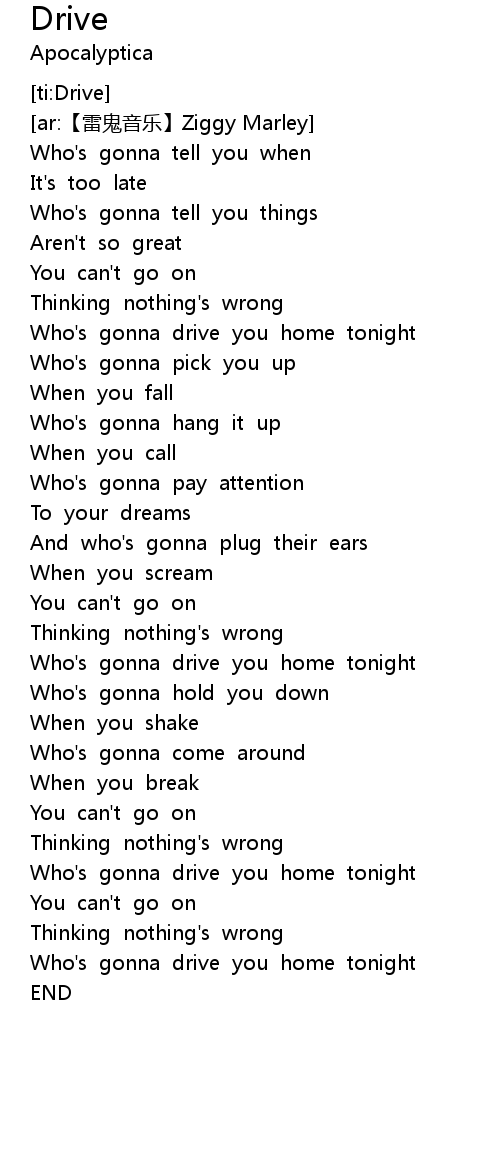 | [03:19.800] | Who's gonna drive you home tonight |