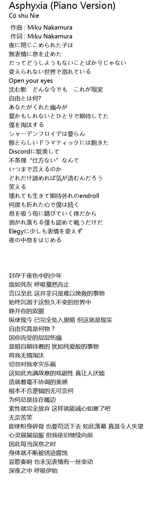 | 歌曲 | Asphyxia (Piano Version) |