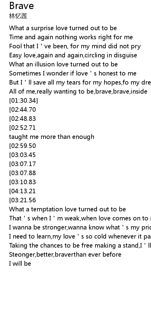 | [03:47.67][02:48.83][01:34.61] | I m learning to be strong and brave |