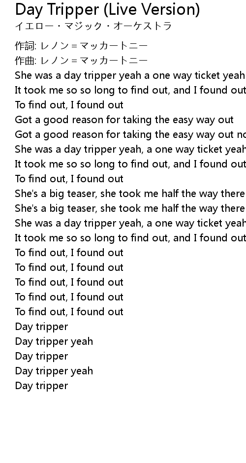 | [00:26.91] | She was a day tripper yeah a one way ticket yeah |