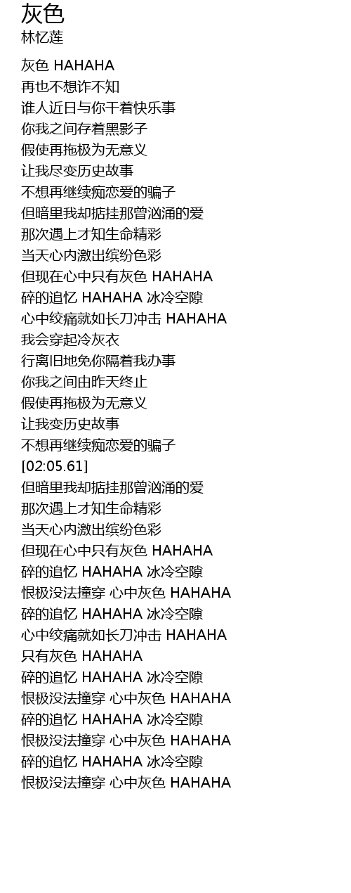 | [02:19.74] | 但现在心中只有灰色 HAHAHA |
