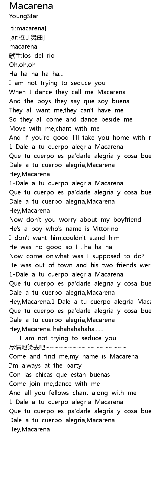 | [01:34.858] | Hey, Macarena. 1Dale a tu cuerpo alegria Macarena |