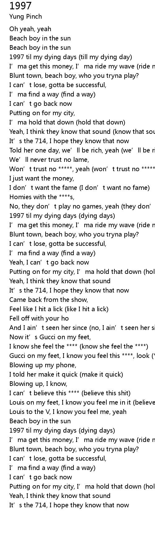 | [00:21.05] | Blunt town, beach boy, who you tryna play? |