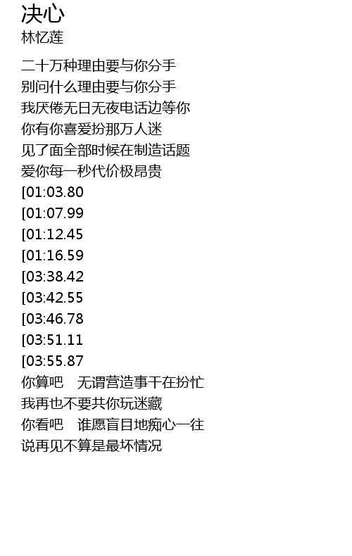 | [04:15.10][03:55.87][03:36.53][03:17.23][02:40.71][01:38.69] | 决心一别是时候 |