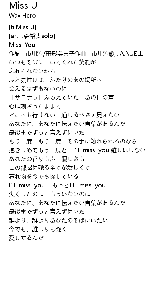 | [00:02.605] | Miss You zuò cí shì chuān chún tián xíng měi xǐ zǐ zuò qǔ shì chuān chún gē A. N. JELL |