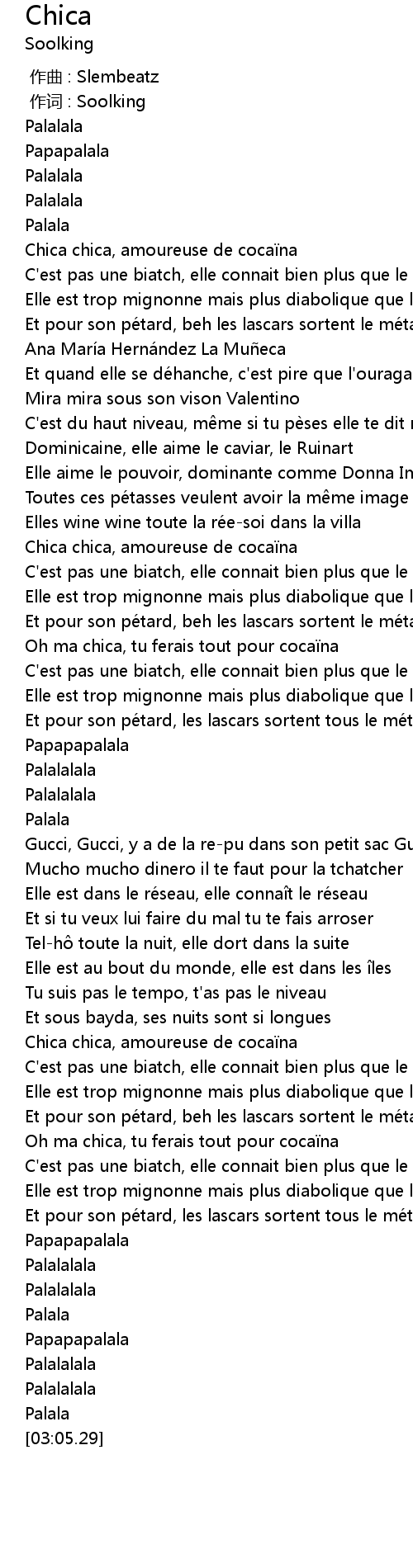 | [02:11.97] | Chica chica, amoureuse de cocaïna |