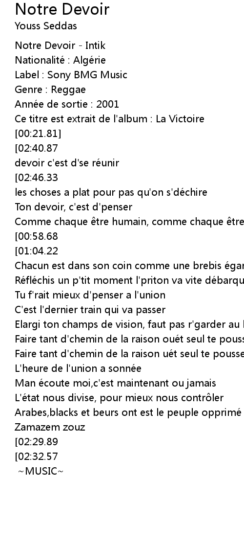| [00:00.81] | Notre Devoir - Intik |