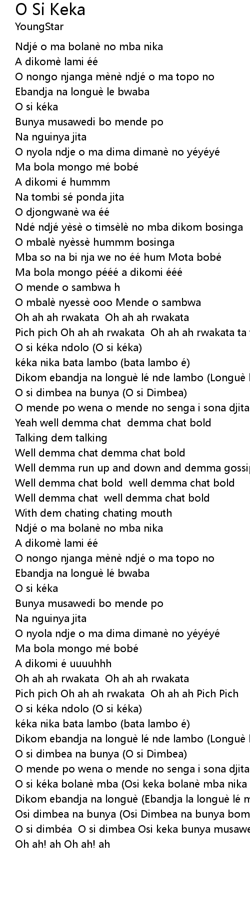 | [00:22.75] | Ndjé o ma bolanè no mba nika |