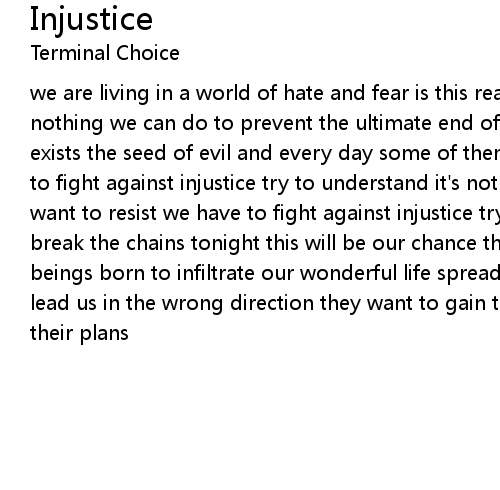 we are living in a world of hate and fear is this really our destiny? is there nothing we can do to prevent the ultimate end of time in every human being exists the seed of evil and every day some of them try to keep it down we have to fight against injustice try to understand it's not the way we want to live we want to resist we have to fight against injustice try to understand we have to break the chains tonight this will be our chance there are always some human beings born to infiltrate our wonderful life spreading the seeds of evil they lead us in the wrong direction they want to gain the ultimate power using us for their plans |