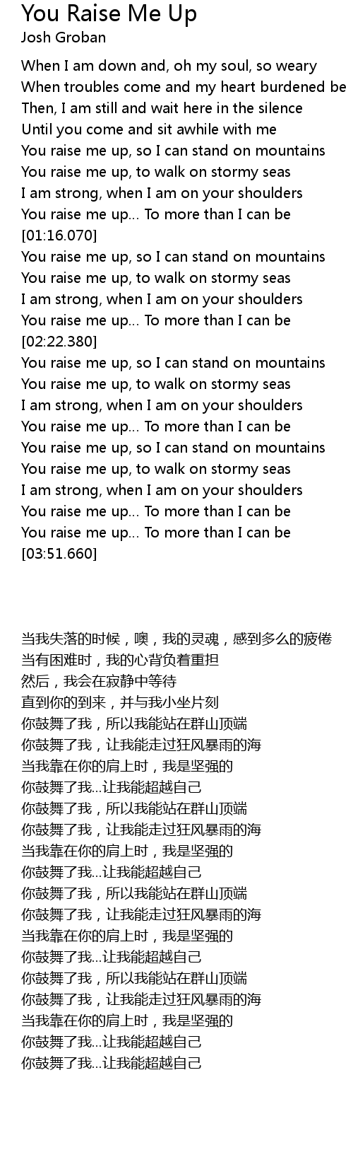 | [01:08.250] | You raise me up To more than I can be |