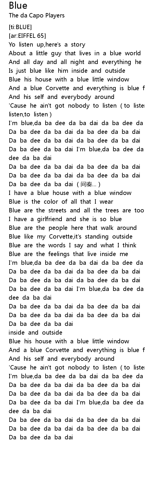 | [02:03.893] | Da ba dee da ba dai I' m blue, da ba dee da ba dai da ba dee da ba dai |