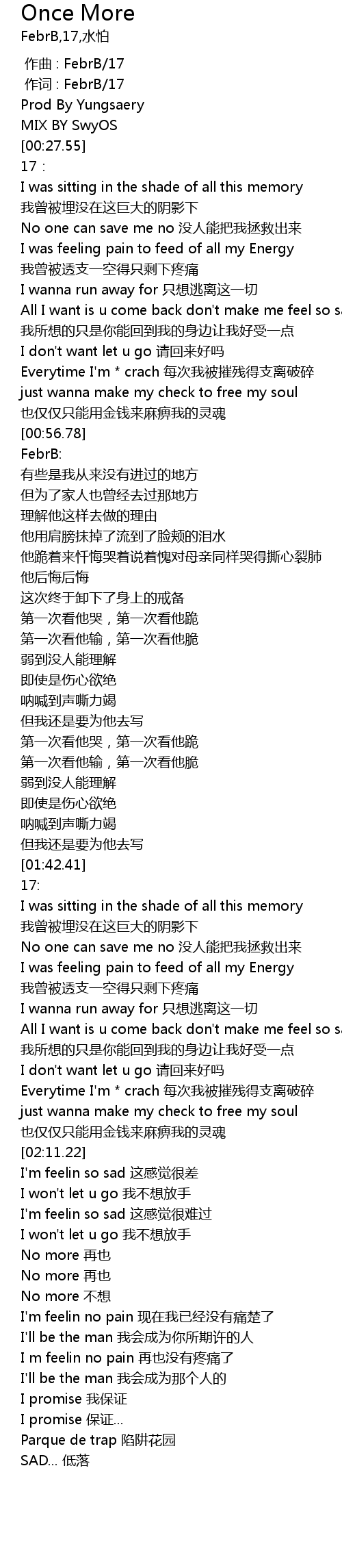 | [00:36.45] | I was feeling pain to feed of all my Energy wǒ céng bèi tòu zhī yī kōng dé zhǐ shèng xià téng tòng |