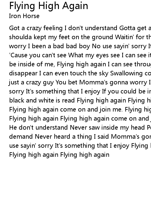 Got a crazy feeling I don't understand Gotta get away from here Feelin' like I shoulda kept my feet on the ground Waitin' for the sun to appear Momma's gonna worry I been a bad bad boy No use sayin' sorry It's something that I enjoy 'Cause you can't see What my eyes see I can see it, I can see it And you can't be inside of me, Flying high again I can see through the mountains Watch me disappear I can even touch the sky Swallowing colours of the sound I hear Am I just a crazy guy You bet Momma's gonna worry I been a bad bad boy No use sayin' sorry It's something that I enjoy If you could be inside my head You'd see that black and white is read Flying high again Flying high again Flying high again Flying high again come on and join me. Flying high again Flying high again Flying high again Flying high again come on and join me. Daddy thinks I'm lazy He don't understand Never saw inside my head People think I'm crazy But I'm in demand Never heard a thing I said Momma's gonna worry I been a bad bad boy No use sayin' sorry It's something that I enjoy Flying high again Flying high again Flying high again Flying high again |