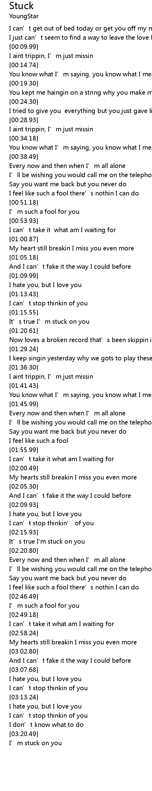 | [03:21.80] | I’m stuck on you |
