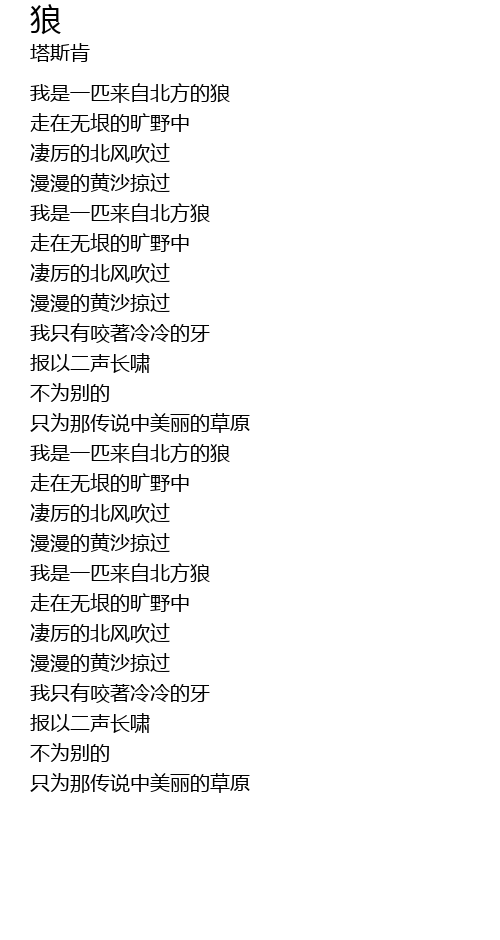 | [00:32.490] | 我是一匹来自北方的狼 |