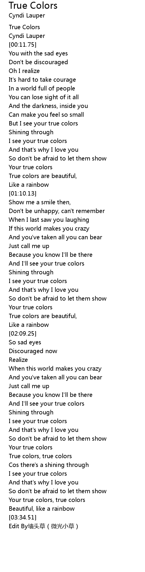 | [03:15.66] | Your true colors, true colors |