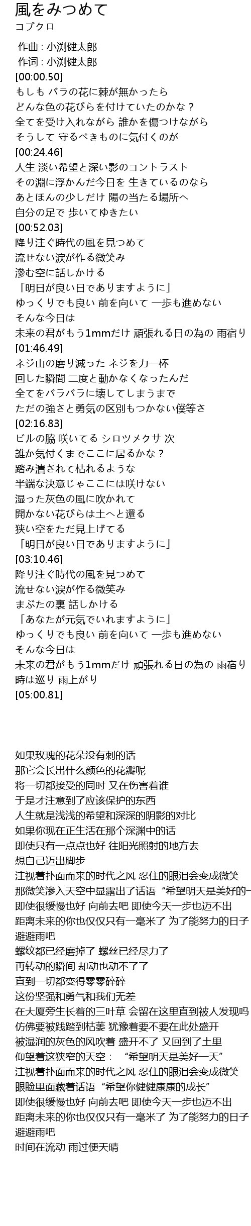 | [00:52.42] | 降り注ぐ時代の風を見つめて 流せない涙が作る微笑み |