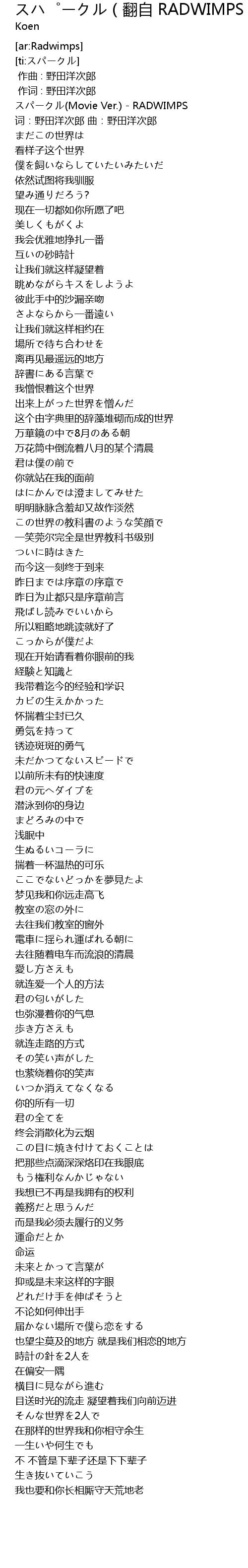| [00:11.86] | スパークル(Movie Ver.) - RADWIMPS |